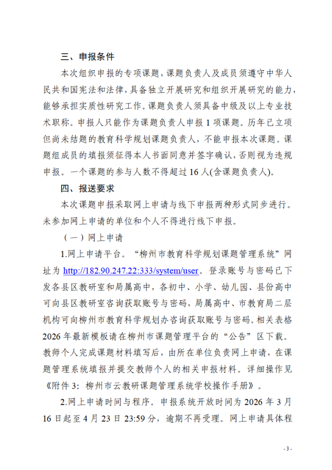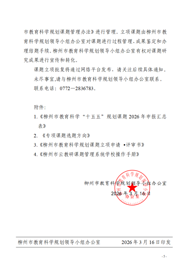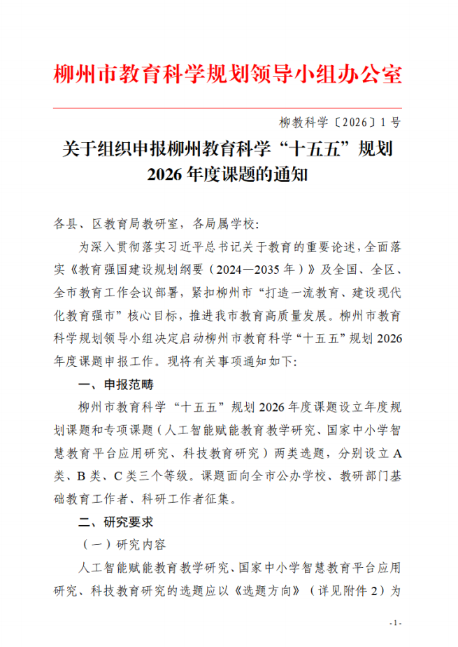 柳州市教育科学“十五五”规划2026年度课题申报工作正式启动!本次设立年度规划课题和专项课题两大类,专项课题聚焦三大方向: