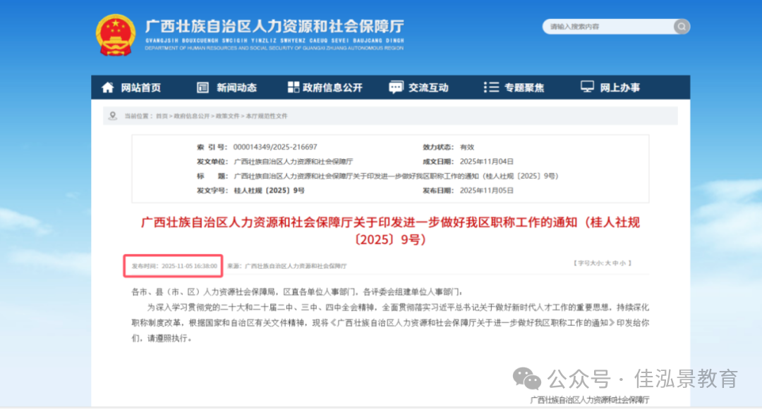 2024年11月5日,广西壮族自治区人力资源和社会保障厅正式印发《关于进一步做好我区职称工作的通知》(桂人社规〔2025〕9号),文件将于2026年1月1日起全面施行。作为关乎广大专业技术人员职业发展的重要政策,此次调整涉及资历计算、成果认定、跨系列申报等核心环节,变化幅度大、影响范围广。