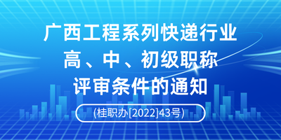 关于印发广西壮族自治区工程系列快递行业高、中、初级职称评审条件的通知(桂职办〔2022〕43号) 来源:广西壮族自治区职称改革工作领